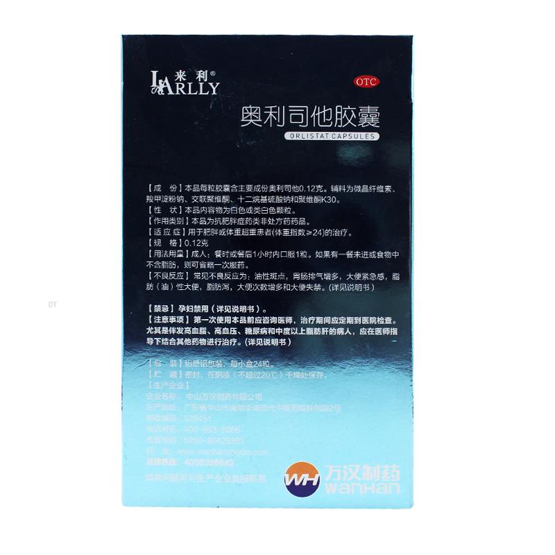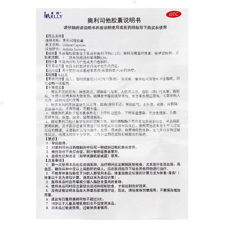 本品每粒胶囊含主要成份奥利司他0.12克。辅料为微晶纤维素、羧甲淀粉钠、交联聚维酮、十二烷基硫酸钠和聚维酮K30。