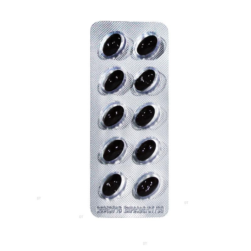 本品为深褐色胶丸,内含橙黄色油状混悬液。