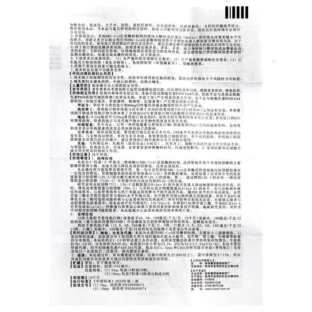 1.吸收、分布及代谢:本品为水溶性HMG-CoA还原酶抑制剂,主要从十二指肠吸收,口服后吸收迅速,高浓度分布于胆固醇生物合成旺盛的肝脏及小肠等,而在脑、肾上腺、生殖器等脏器的分布极低。本品给药后1-2小时即达最大血药浓度,血药浓度随给药量的增加而依存性增加。半衰期约为1.5小时,分布容积为830.0L。血清蛋白结合率为53.1%,AUC为14.0±3.9ng×hr/ml。本品主要经肝脏代谢,但不经细胞色素P4503A4代谢,稳态AUCs、Cmax和Cmin分析均提示本品(普伐他汀)无论是每日一次或每日二次服用,体内都没有蓄积。
