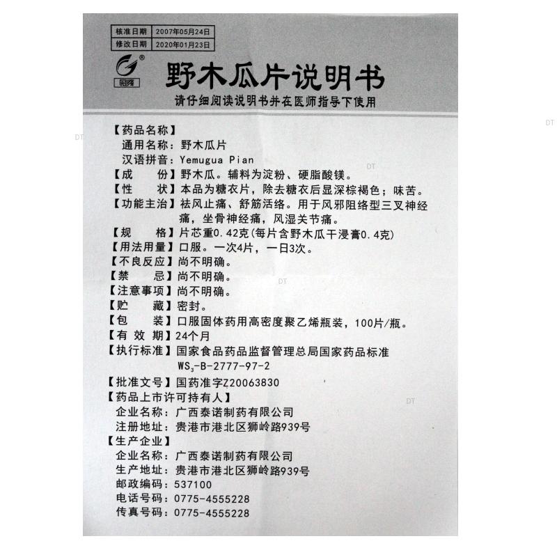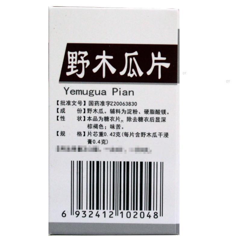 野木瓜。辅料为淀粉、硬脂酸镁。