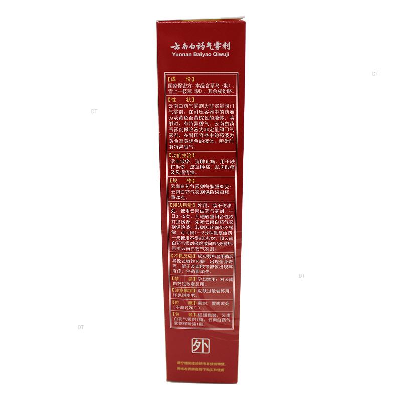 4. 使用云南白药气雾剂保险液时先振摇,喷嘴离皮肤5~10厘米,喷射时间应限制在3~5秒钟,以防止局部冻伤。