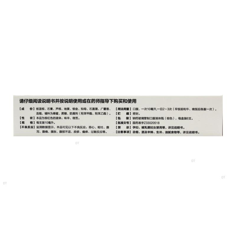 本品主要成份板蓝根、石膏、芦根、地黄、郁金、知母、石菖蒲、广藿香、连翘,辅料为蜂蜜、蔗糖、防腐剂(羟苯甲酯、羟苯乙酯)。